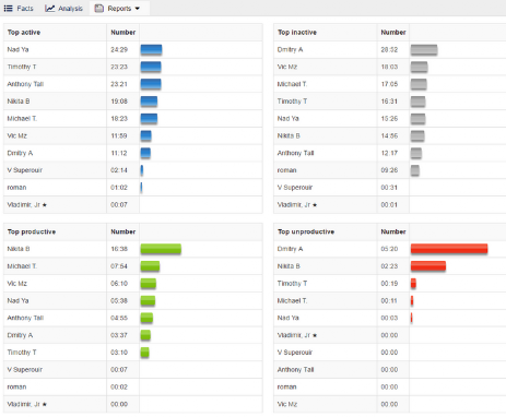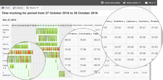 StaffCop Enterprise registra el inicio y el final de la jornada laboral de cada empleado, incluyendo almuerzos y pausas de café, etc. Permite a los ejecutivos y empleados, por sí mismos, mejorar la disciplina en el lugar de trabajo y reducir los períodos de inactividad. La supervisión del tiempo de trabajo le permite evitar fugas de información confidencial, visitas a sitios web improductivos y otras actividades de eventos no deseados. Muestra al usuario una imagen clara y completa de las actividades de cada empleado.